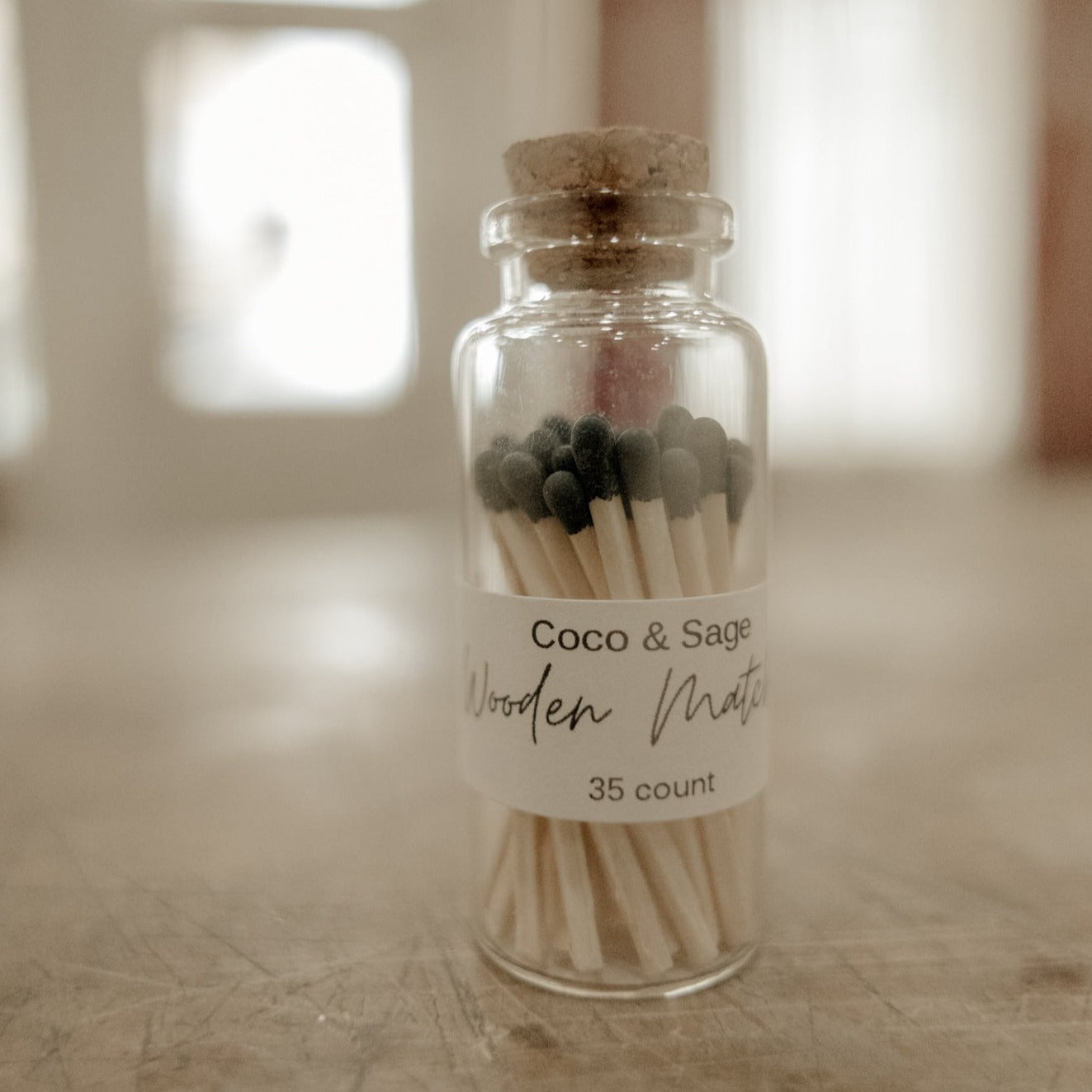 Black wooden matches, 2 inches long. Striker sticker on the bottom makes for a super cute gift to add with a candle!